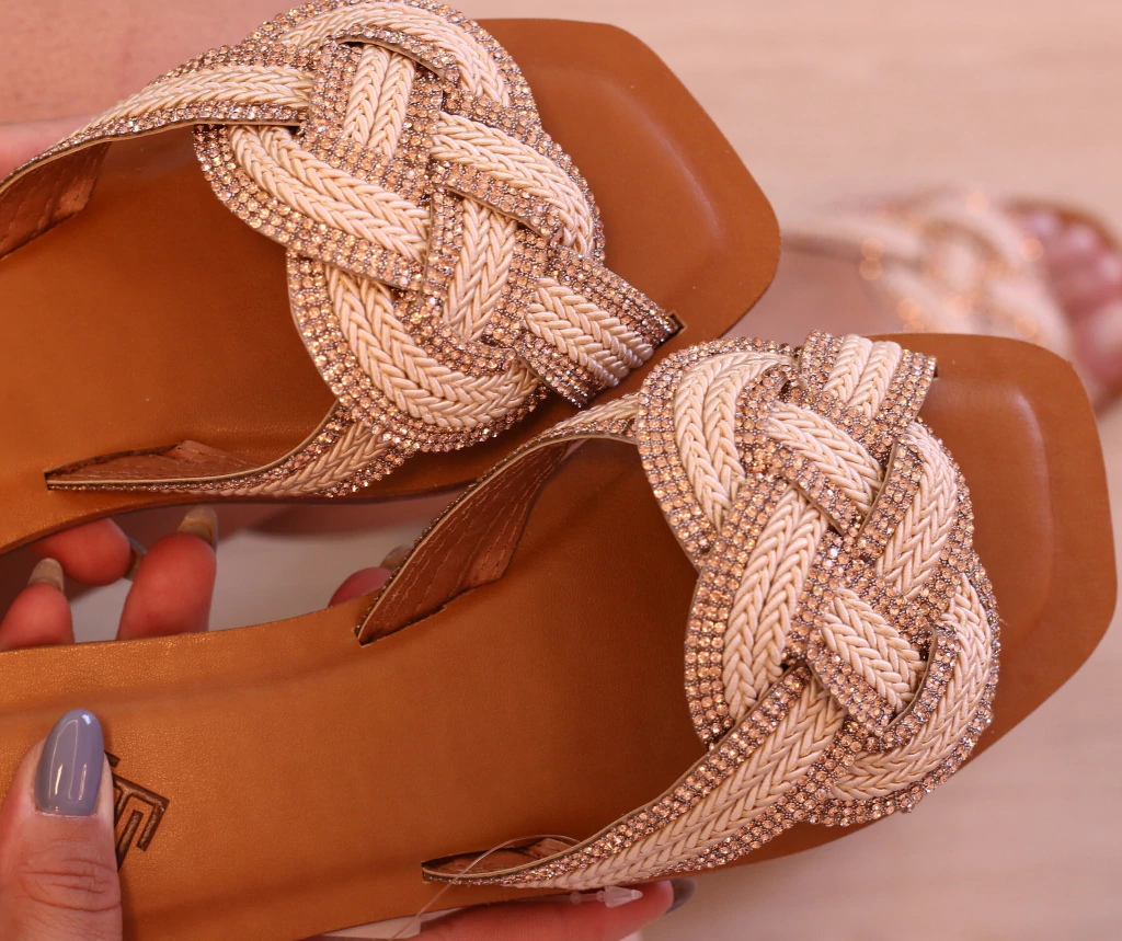 Rasteira em couro legítimo com cabedal trançado e aplicação de strass que contorna toda a peça. Um modelo que une elegância artesanal e brilho na medida certa para iluminar seus looks.